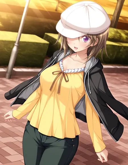 outfit04, jacket, black jacket, hooded jacket, open clothes, opened jacket, jacket on shoulders, shirt, yellow shirt, frilled shirt, long sleeves, pants, denim pants, black pants, cap, white cap, cap over one eye,