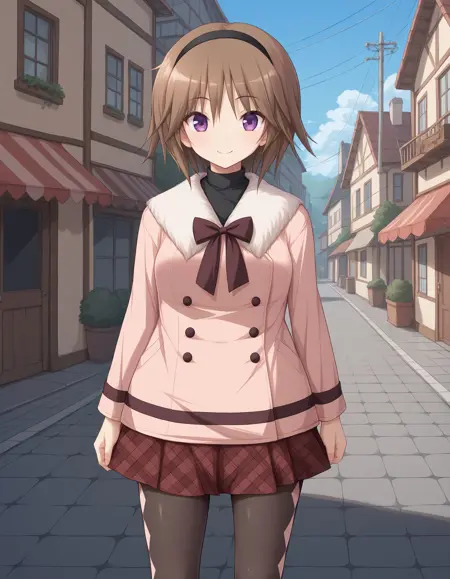 outfit02、ヘアバンド、黒いヘアバンド、コート、タイトな服、閉じたコート、ファー縁取りコート、ピンクのコート、短めのコート、ボウタイ、茶色のボウタイ、シャツ、黒いシャツ、タートルネックシャツ、スカート、ふくらはぎスカート、アーガイル柄スカート、赤いスカート、ミニスカート、パンティーストッキング、黒いパンティーストッキング、トランプ模様のパンティーストッキング、