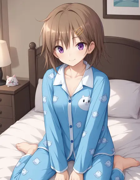 outfit05、ヘアクリップ、花柄ヘアクリップ、パジャマ、動物柄パジャマ、青いパジャマ、シャツ、カラーアンドシャツ、長袖、袖が手首より長い、パンツ、