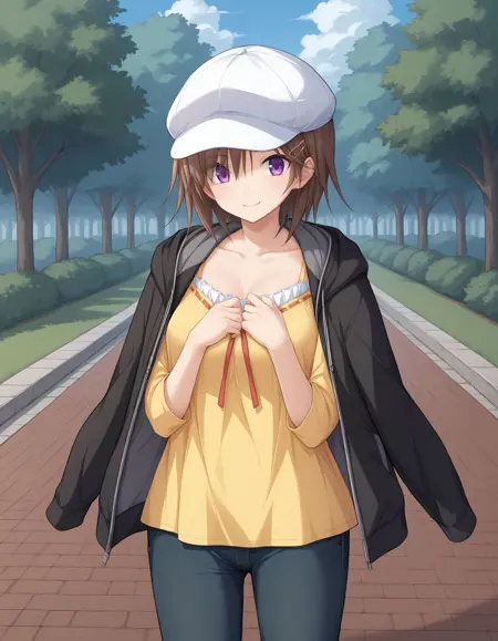 outfit04、ジャケット、黒いジャケット、フード付きジャケット、オープンな服、開いたジャケット、肩にかけたジャケット、シャツ、黄色のシャツ、フリル付きシャツ、長袖、パンツ、デニムパンツ、黒いパンツ、キャップ、白いキャップ、片目にかかったキャップ、