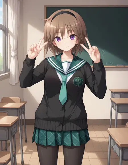 outfit01、ヘアバンド、黒いヘアバンド、カーディガン、黒いカーディガン、セーラー collar、アーガイル柄セーラー collar、緑のセーラー collar、ネクタイ、薄緑のネクタイ、スカート、アーガイル柄スカート、緑のスカート、プリーツスカート、パンティーストックings、黒いパンティーストッキング、