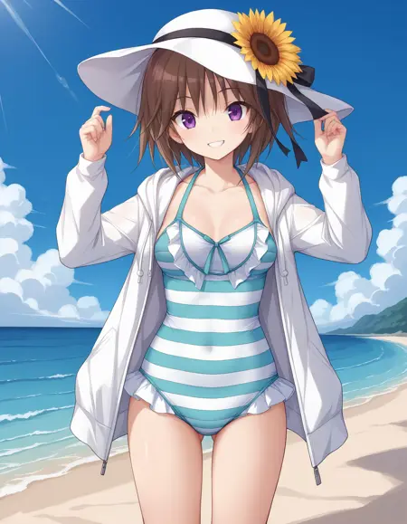 outfit06、水着、ワンピース水着、縞模様水着、フリル付き水着、ジャケット、白いジャケット、フード付きジャケット、オープンな服、開いたジャケット、帽子、白い帽子、黒いリボンがついた帽子、帽子にひまわり