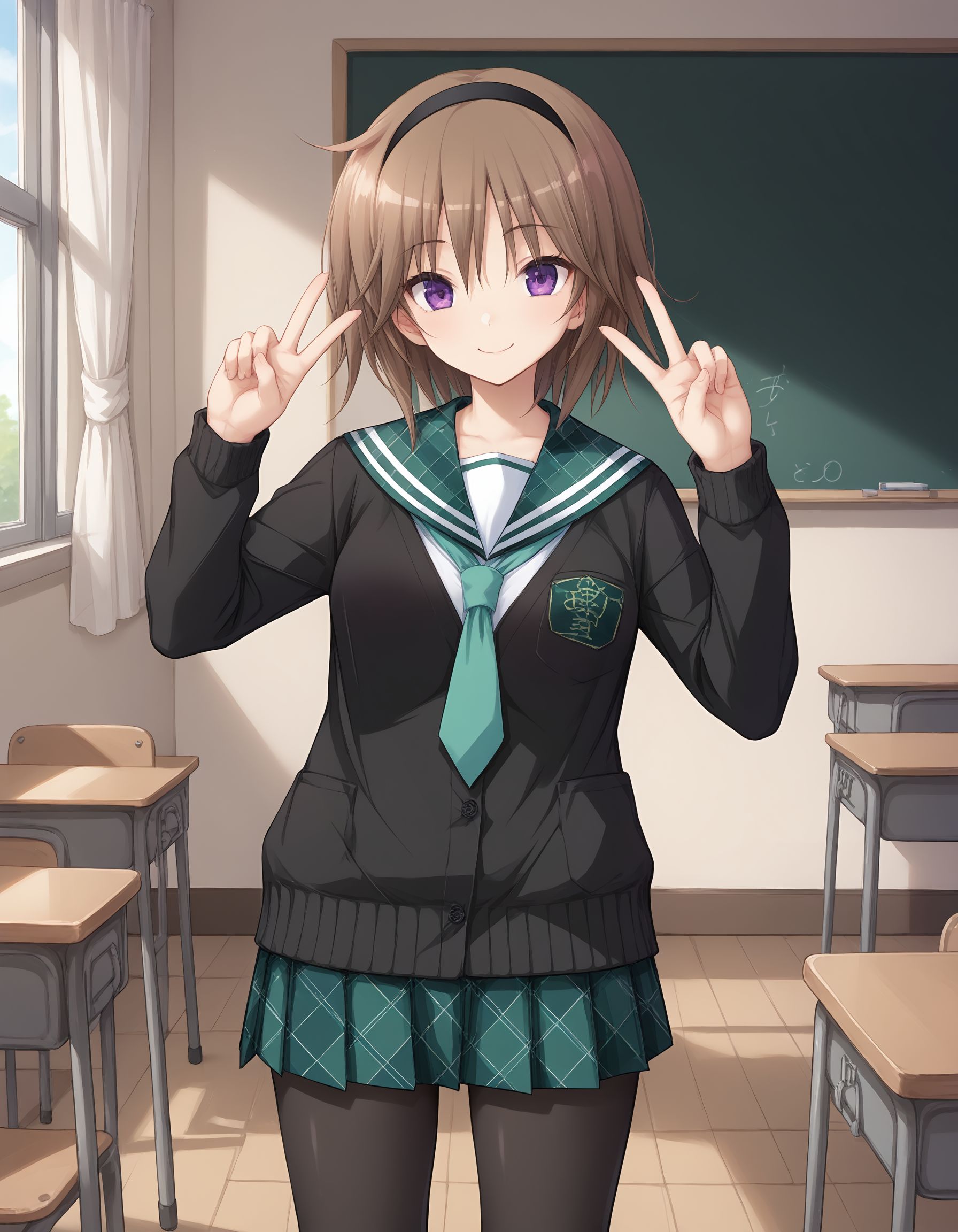 outfit01, 헤어밴드, 검은 헤어밴드, 카디건, 검은 카디건, 선원 collar, 아르글레이 무늬 선원 collar, 녹색 선원 collar, 넥타이, 연한 녹색 넥타이, 치마, 아르글레이 무늬 치마, 녹색 치마, 접히는 치마, 팬티후스, 검은 팬티후스,