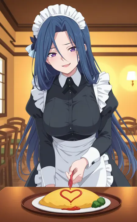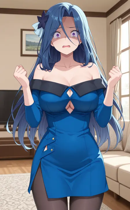 1girl,sksh1r1zean1m,anime coloring,solo,lady,blue hair,purple eyes,{ | half-closed eyes},mole under eye, long hair,breasts,hair ornament,hair between eyes,bare shoulders,sleeves,blue dress,collarbone,pantyhose,detached collar,necklace,looking at viewer,best quality,masterpiece,sensitive , lora:SokushiCheatRizeAnimeNoobAI3:1