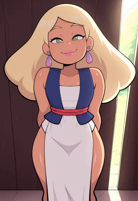 태그: Jay-ten, 금발, 긴 머리, 볼륨 있는 머리, 녹색 눈, 보라색 귀걸이, 분홍색 입술, 밝은 피부, 어두운 피부, 흰 치마, 파란 조끼, 허리에 빨간 끈