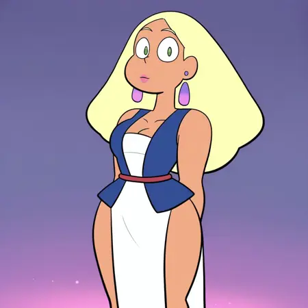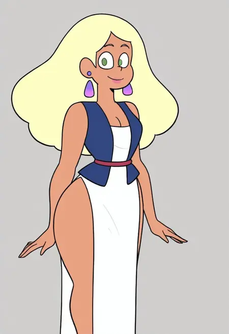 标签:Jay-Ten,金色头发,长发,蓬松头发,绿色眼睛,紫色耳环,粉红色嘴唇,浅色皮肤,深色皮肤,白色裙子,蓝色背心,腰间红色绳子,