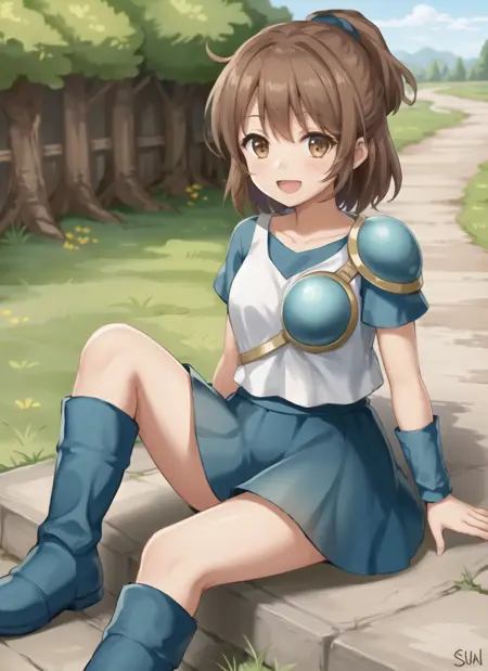 推荐提示:arlenadja, 1girl, solo, skirt, brown hair, blue skirt, brown eyes, boots, short hair, half updo, blue footwear, knee boots, armor, :D