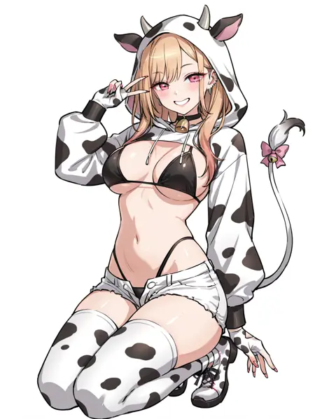 black string bikini, shrug \(clothing\), cow print fingerless gloves,revealing cow print hoodie,cow print thighhighs,cow print shoes,short shorts,open shorts,highleg bikini, cow tail,tail bow,tail bell