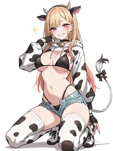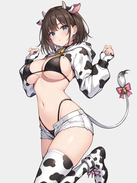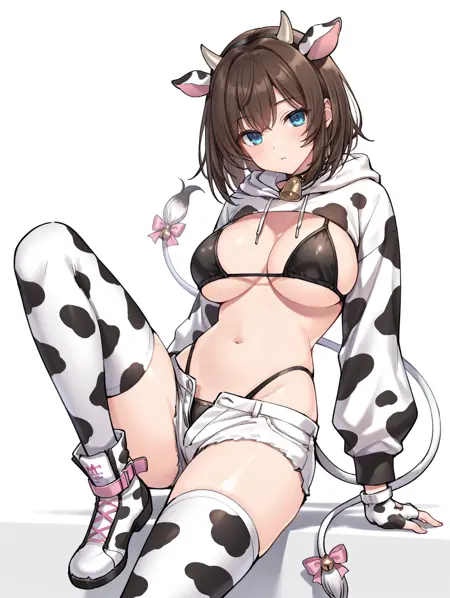 black string bikini, shrug \(clothing\), cow print fingerless gloves,revealing cow print hoodie,cow print thighhighs,cow print shoes,short shorts,open shorts,highleg bikini, cow tail,tail bow,tail bell