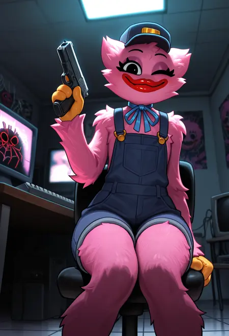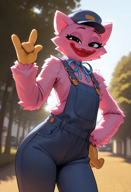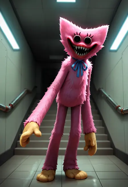 📝 Кисси Мисси — персонаж игры Poppy Playtime, созданный компанией Playtime Co. в 1985 году, через год после Хагги Вагги. Она имеет высокое стройное тело с длинными конечностями, покрытое розовым мехом, с желтыми ладонями и ступнями, большими глазами с длинными ресницами и синим бантом на шее. В отличие от других враждебных игрушек, Кисси Мисси проявляет доброжелательность и помогает главному герою, открывая для него решетку во второй главе игры。