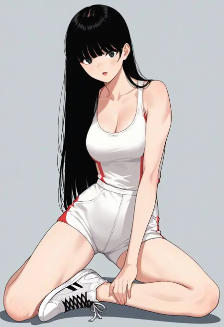 원피스. 스니커즈. 흰색 옷. 팔 없음. 짧은 바지. 다리 노출. 젖가슴 노출