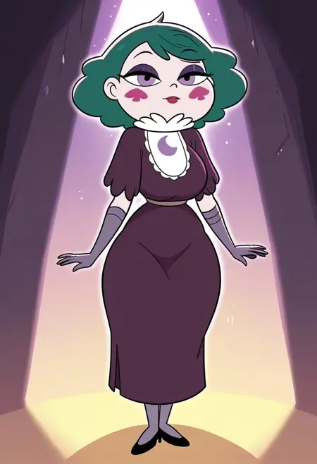 태그: Eclipsa, 녹색 머리카락, 짧은 머리, 보라색 눈, 메이크업, 보라색 아이섀도우, 립스틱, 얼굴 무늬, 장갑, 진한 보라색 드레스, 검은 신발, 스타킹, 모자
