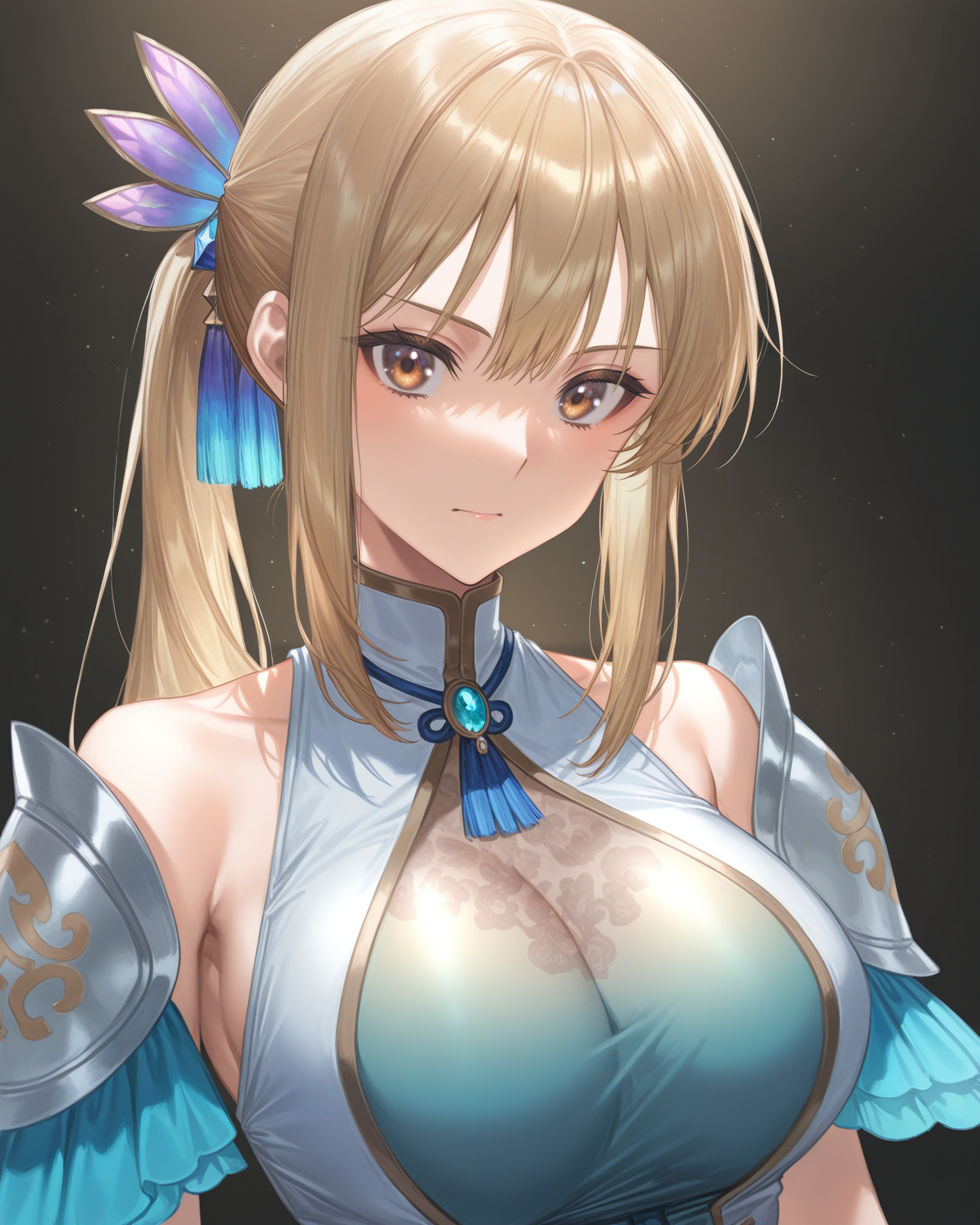 <lora:WangYuanjiDW9_Illustrious:1>, Wang Yuanji, blonde hair, ponytail, brown eyes, large breasts, dress, see-through cleavage, bare shoulders, pauldrons, vambraces, knee boots,