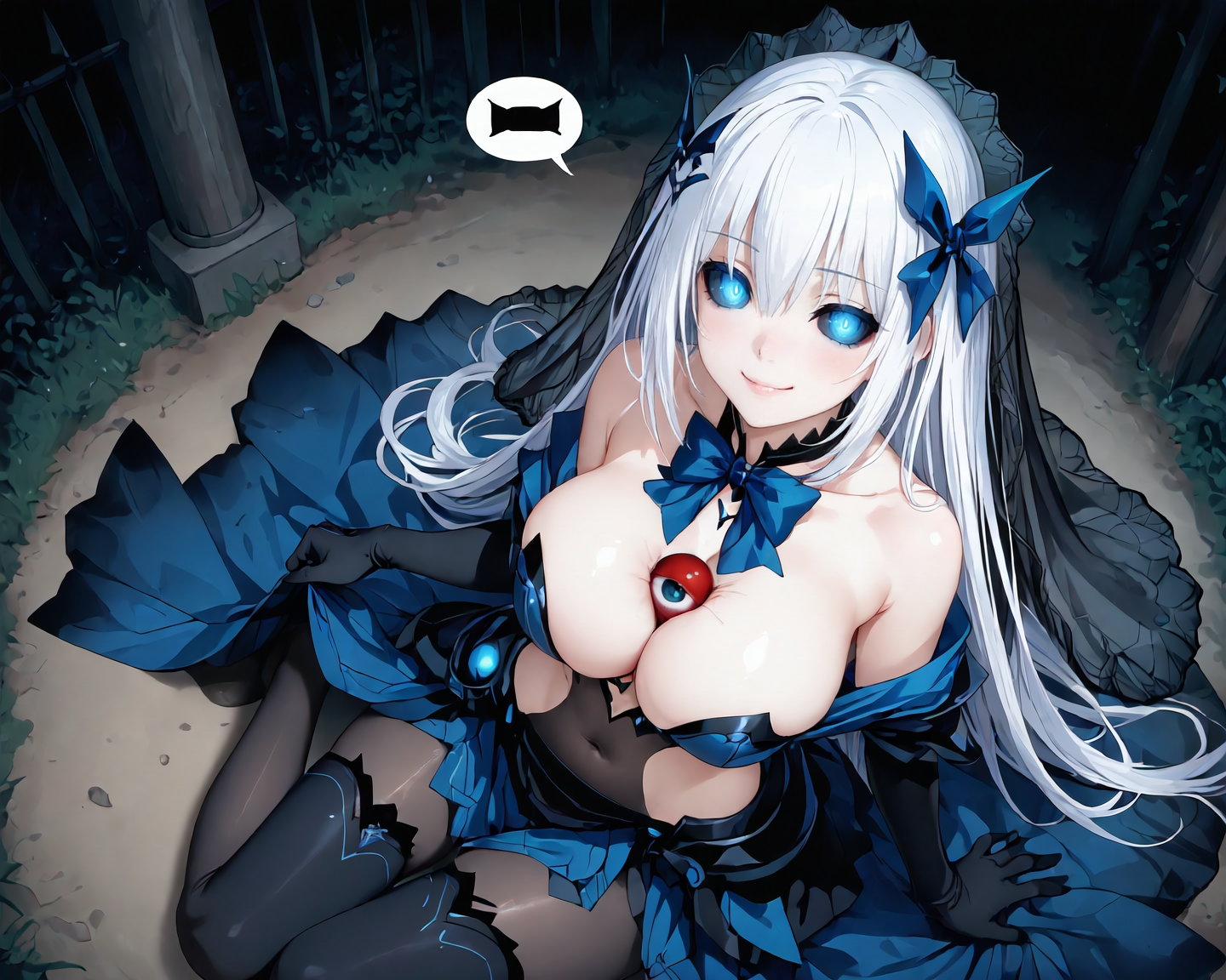 revealing clothes,navel,very long hair,blue eyes,white hair,hair between eyes,elbow gloves,bare shoulders,black gloves,skirt hold,black thighhighs,blue skirt,bow,bowtie,hair ornament,miniskirt,jewelry,midriff,blue bow,black veil,off shoulder, (black pantyhose, high_heels:1.3),