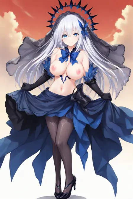 露骨服装,肚脐,超长发,蓝眼睛,白发,头发遮眼,肘部手套,裸露肩膀,黑色手套,裙摆手持,黑色过膝袜,蓝色裙子,蝴蝶结,领结,发饰,超短裙,珠宝,露脐,蓝色蝴蝶结,黑色面纱,露肩,(黑色连裤袜,高跟鞋:1.3)
