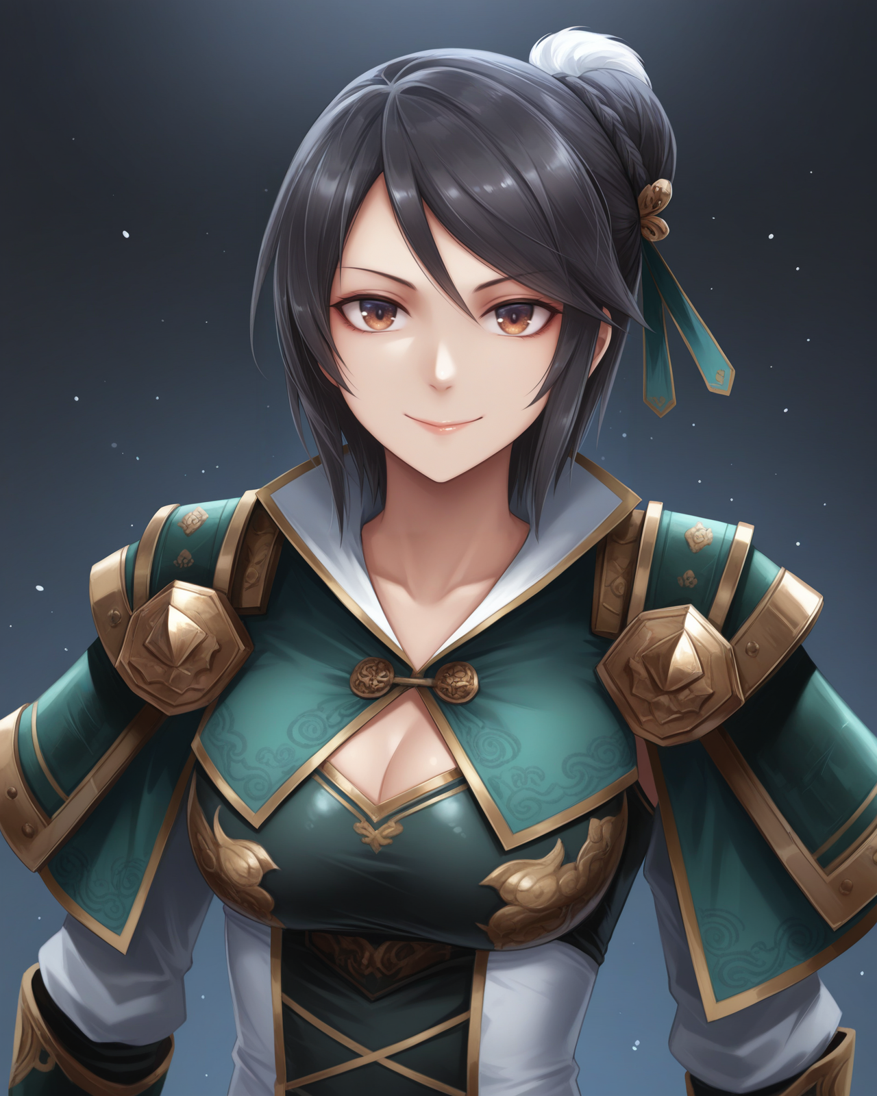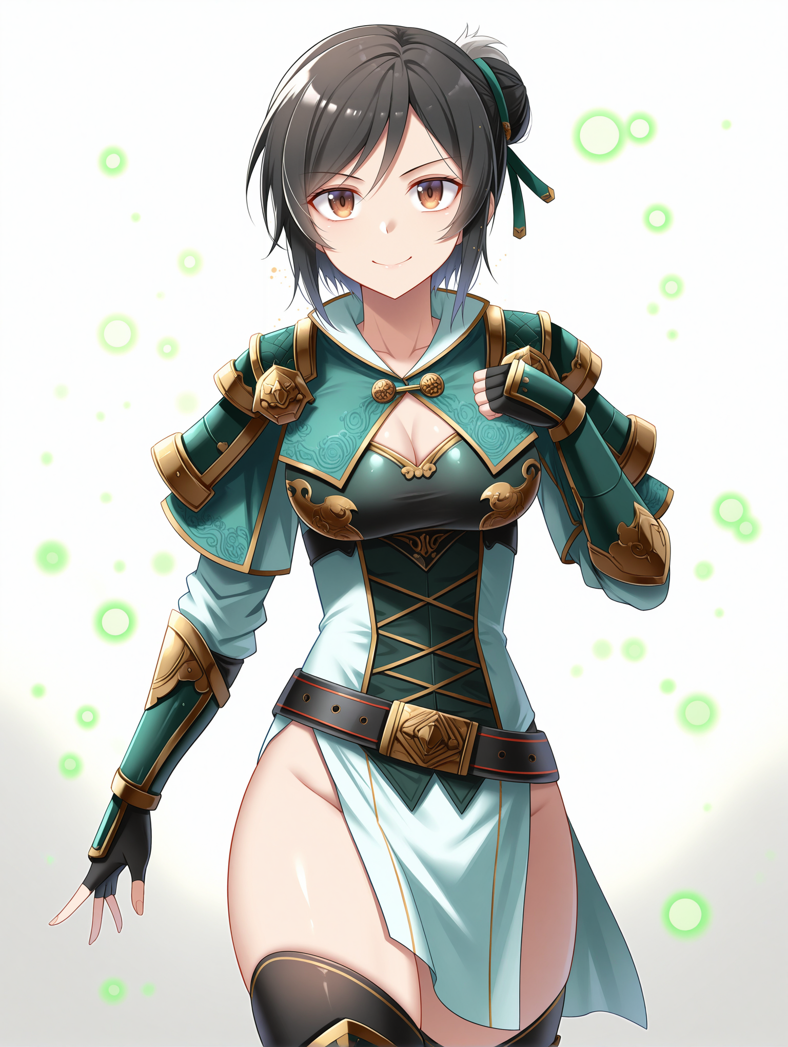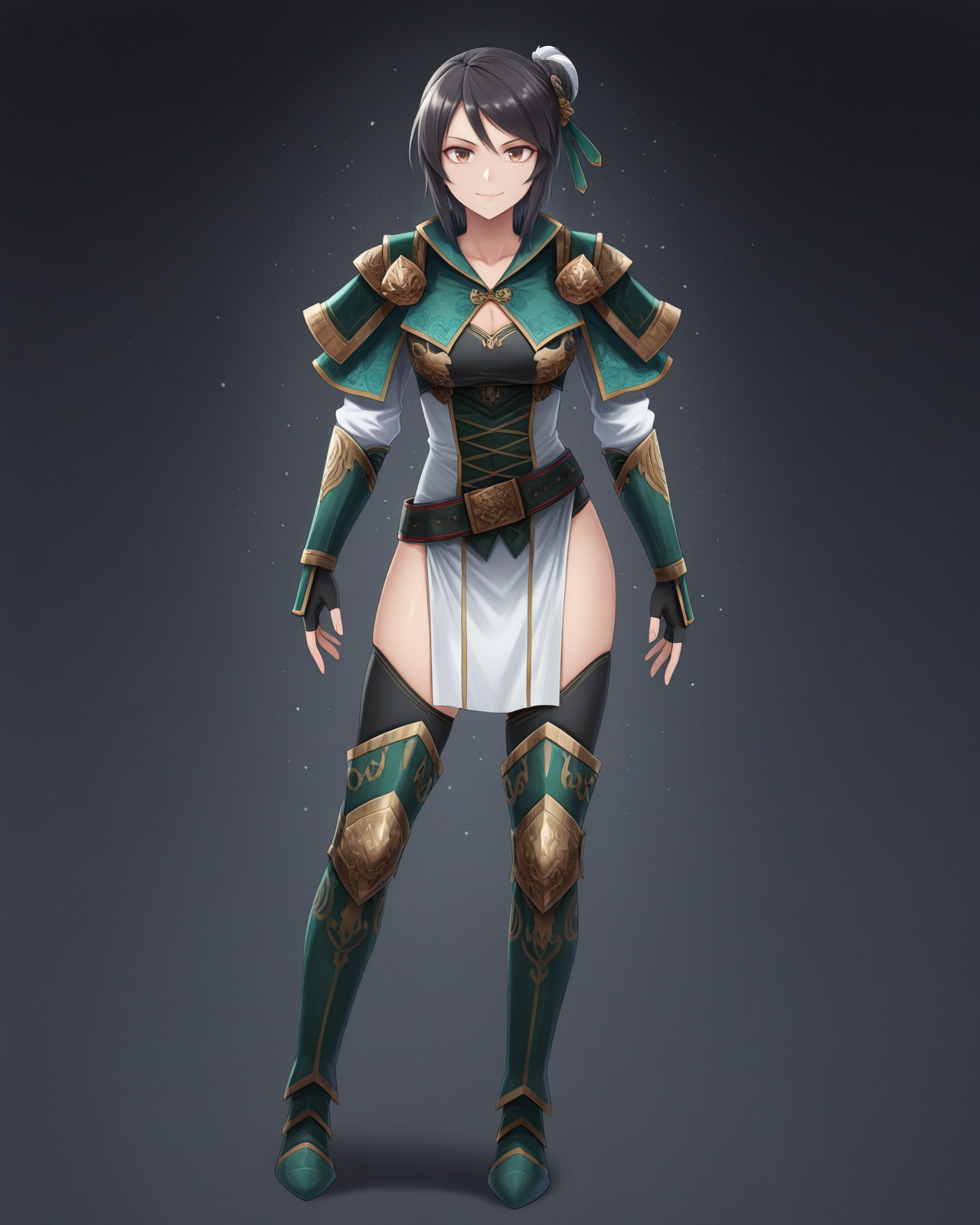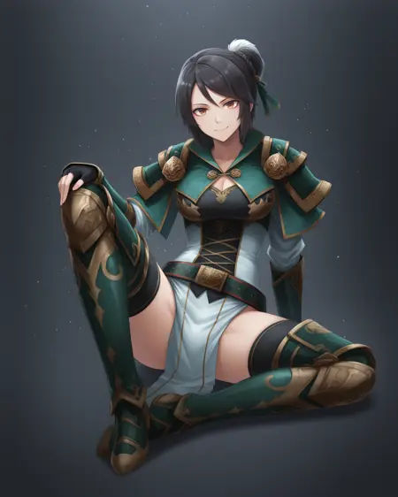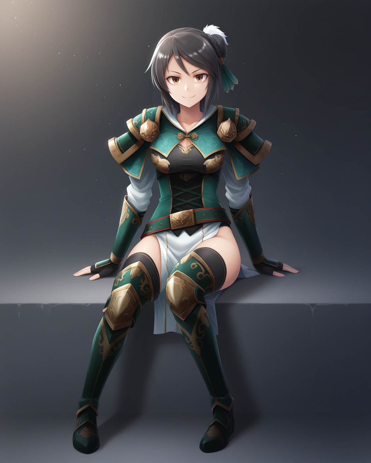 <lora:XingcaiDW8_Illustrious:1>, Xingcai, 短发, 黑发, 发饰, 棕色眼睛, 中等胸部, 盔甲, 肩甲, 胸衣, 腰带, 护臂, 无指手套, 盆骨帘, 过膝长靴,