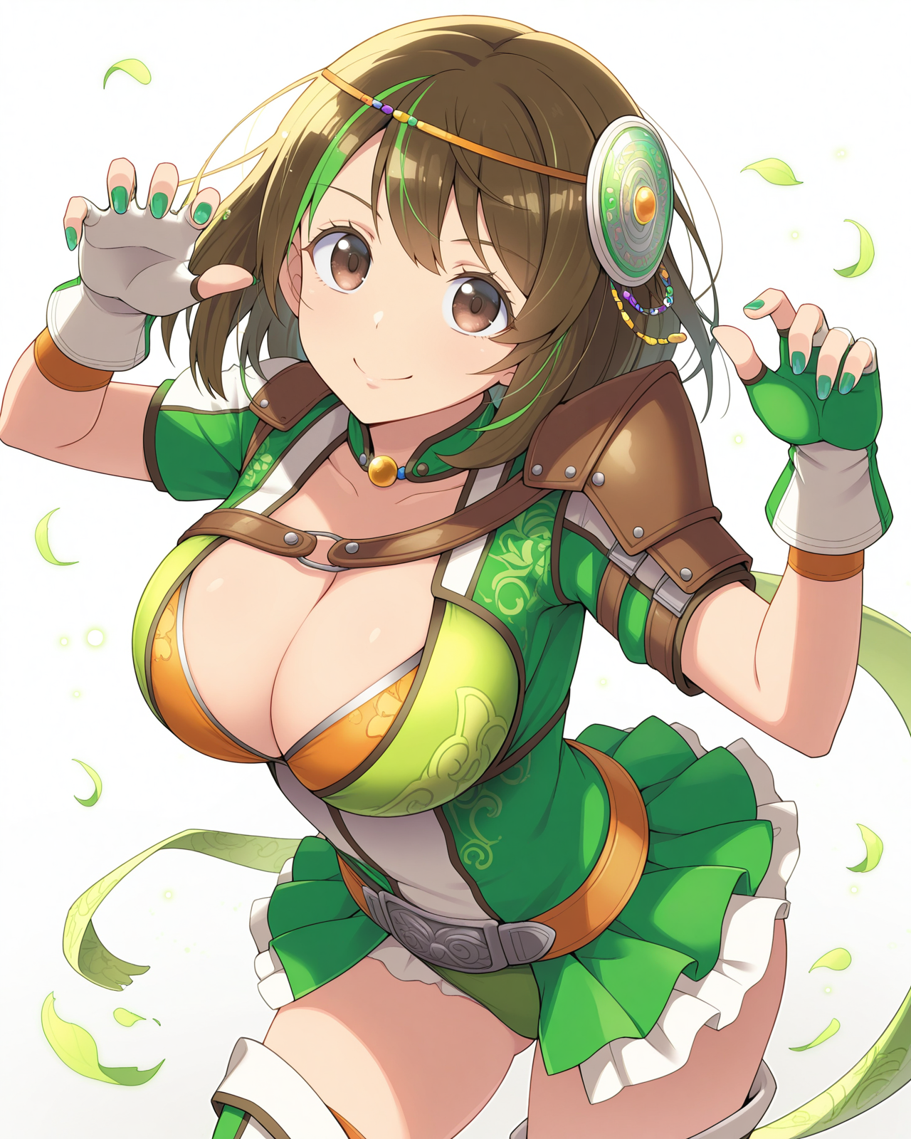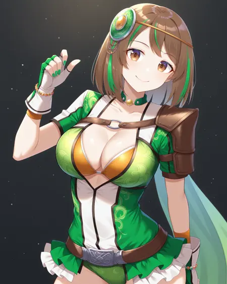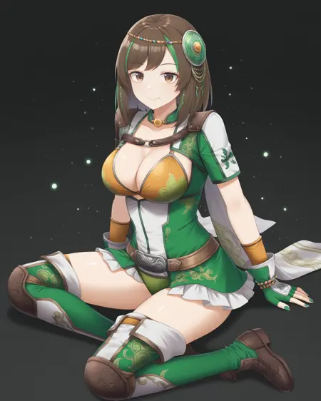 <lora:BaoSanniangDW8_Illustrious:1>, 包三娘,棕色眼睛,棕色头发,中等长度头发,条纹发色,绿色头发,发饰,大胸部,绿色紧身衣,短袖,橙色胸衣,乳沟,腰带,肩甲,露指手套,大腿靴,