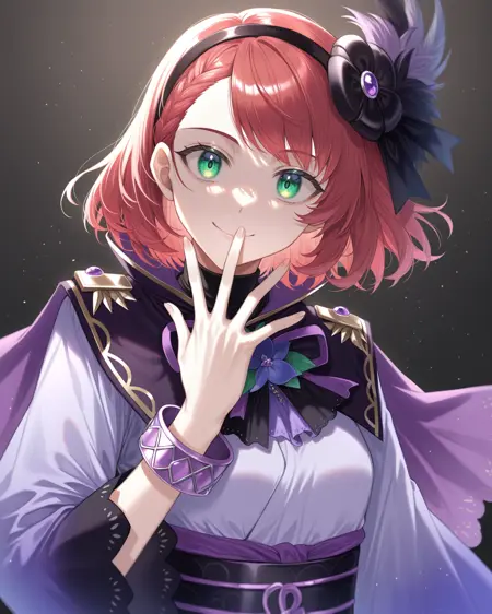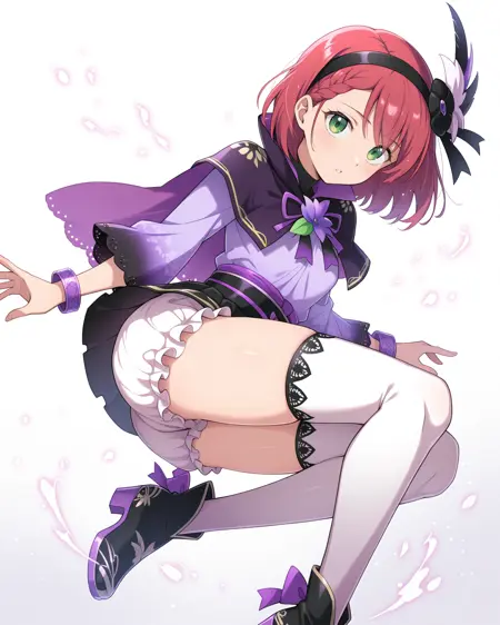 <lora:GraciaSW3_Illustrious:1>, Hosokawa Gracia, red hair, short hair, hairband, hair ornament, green eyes, small breasts, purple shirt, purple sleeves, purple bracelet, black skirt, bloomers, purple capelet, white thighhighs, black shoes,