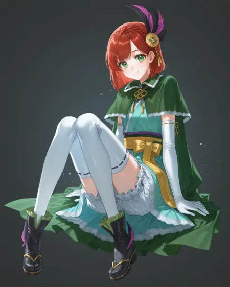 <lora:GraciaSW2_Illustrious:1>, Hosokawa Gracia, red hair, short hair, hair ornament, green eyes, small breasts, green dress, cape, capelet, white lace elbow gloves, yellow sash, bloomers, ribbon-trimmed thighhighs, black shoes,