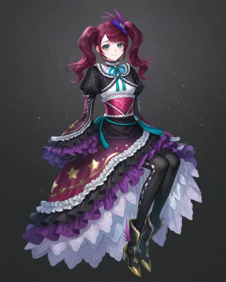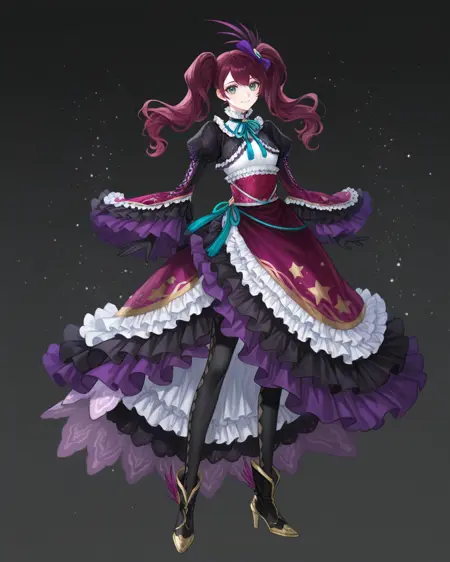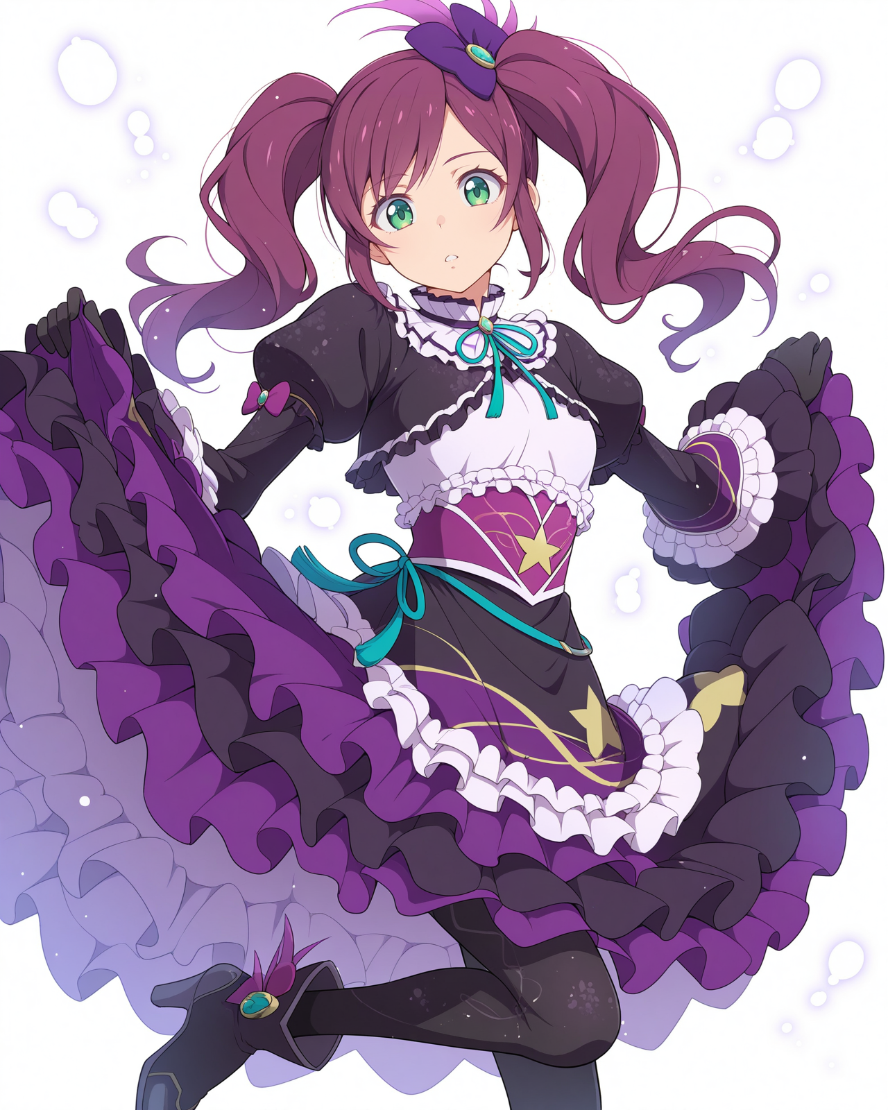 <lora:GraciaSW4_Illustrious:1>, Hosokawa Gracia, 紫发, 双马尾, 发饰, 绿眼, 小胸, 黑色连衣裙, 紫色裙子, 黑色肘套, 蕾丝边饰, 荷叶边, 丝带, 黑色腿部穿着, 黑色高跟靴,
