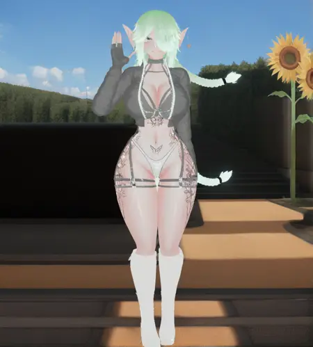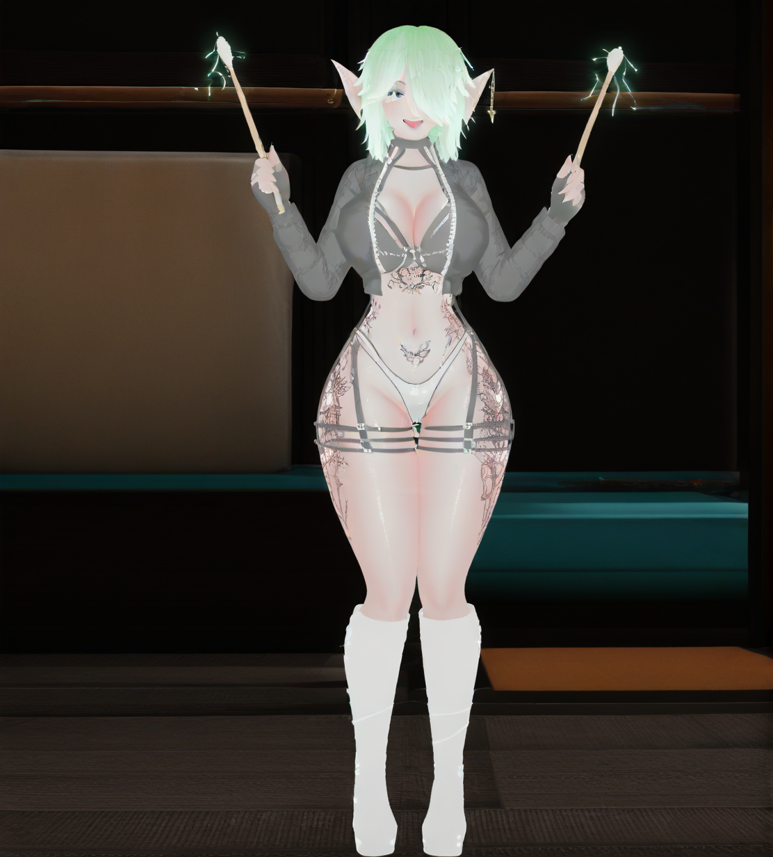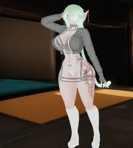 服装:黑色手套,白色长靴,白色高腰内裤,黑色内衣,背带,夹克,