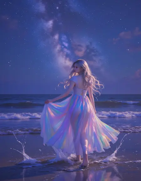 通过融合多个LoRA强化了彩虹色长裙和少量水元素,单一LoRA配合触发词能稳定呈现彩虹色长裙。我以前使用多张海边图片,但更改背景和环境完全不成问题。