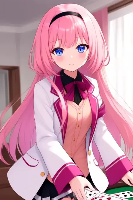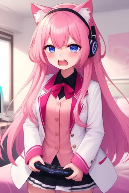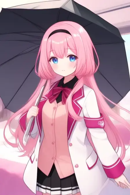 トリガー語: Suo Sango、アニメ風の女の子。画像には、長いピンク色の髪が自由に広がるアニメ風のキャラクターが描かれています。髪はゆるやかに波打つようにスタイリングされ、柔らかく流れるような外観を呈しています。キャラクターは青い目を持っており、ピンクの髪と黒いヘッドバンドと対照的です。キャラクターは白いジャケットにピンクのアクセント(ピンクのカラーとボタン)を施した学校制服を着ており、ジャケットの下には黒いボウタイを結んだピンクのシャツを着ています。また、スカートは黒色で、裾に白いストライプが入っています。