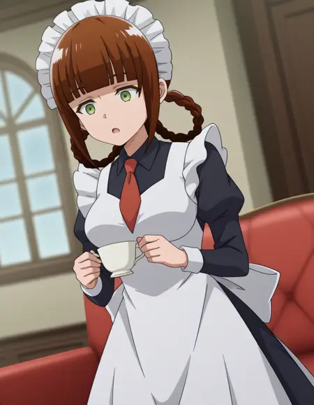 <lora:margaret-around_40_otoko_no_isekai_tsuuhan-ixl-anime-soralz:1>, margaret (around 40 otoko no isekai tsuuhan), short hair, brown hair, braided hair rings, black hair ribbon, blunt bangs, green eyes