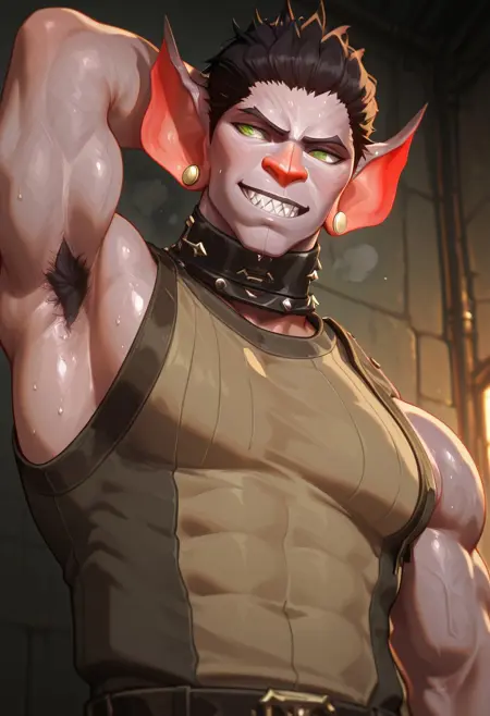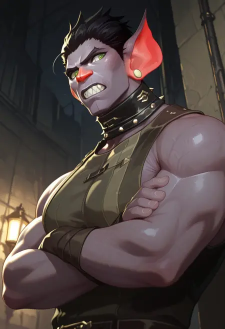 sc4r, grey skin, bat ears, black hair, green eyes, pink nose, muscular, colored skin, black hair, pointy ears,