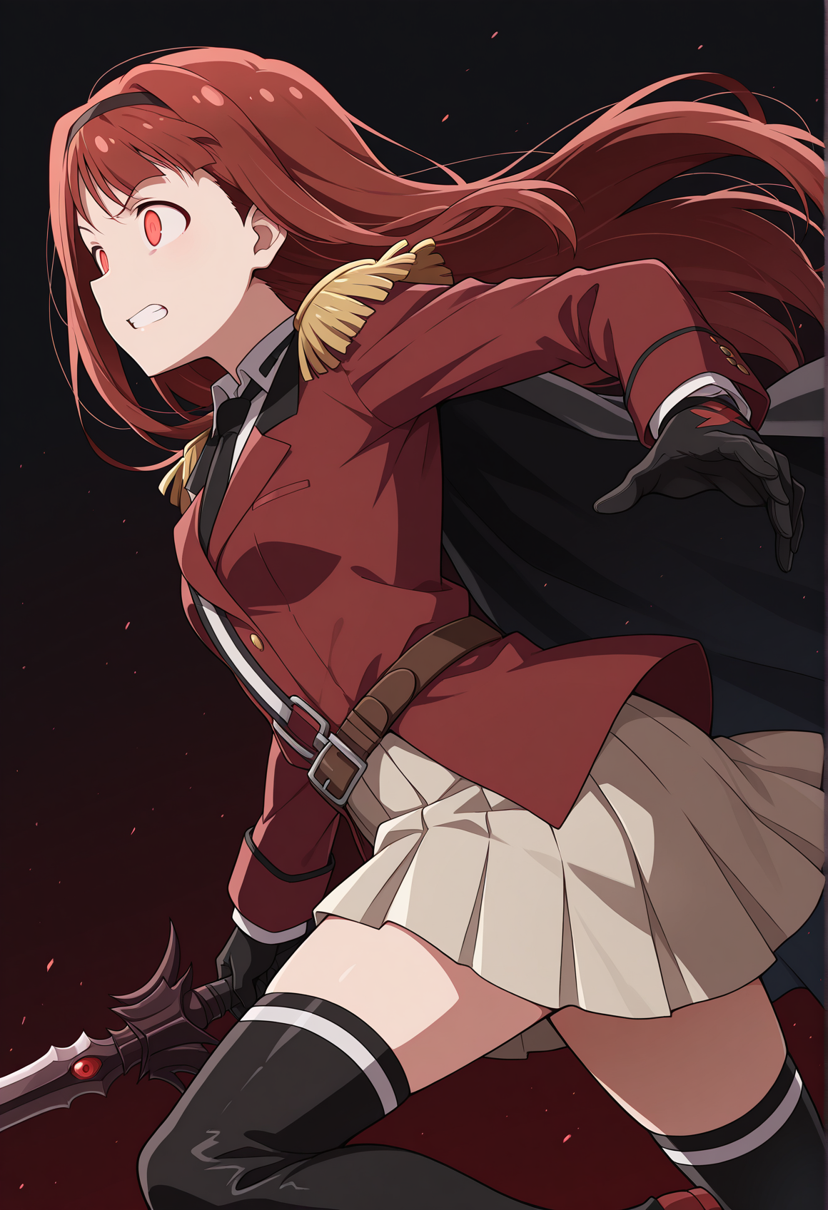 服装: 红色军装外套,肩章,黑色手套,黑色领带,腰带,黑色披风,百褶裙,黑色大腿靴,