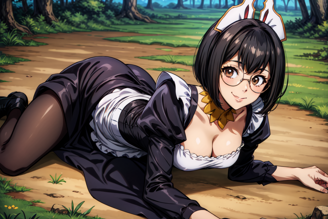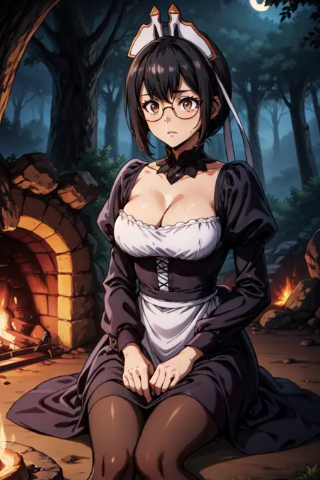 복장: "메이드 드레스, 검정 팬티스타킹"