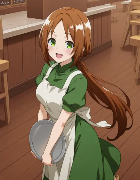 waitress outfit, green dress, white apron, short sleeves, puffy sleeves, sandals
