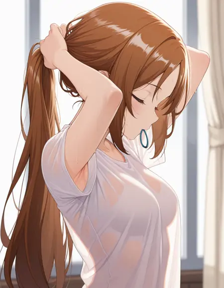 <lora:azalea-around_40_otoko_no_isekai_tsuuhan-ixl-anime-soralz:1>, azalea (around 40 otoko no isekai tsuuhan), very long hair, brown hair, parted bangs, green eyes, low ponytail