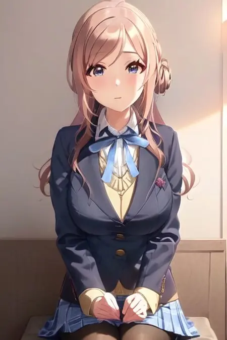 트리거 단어: rinami_a, 연한 갈색 머리카락, 단일 머리결, 빗어낸 앞머리, 측면 머리카락, 긴 머리, 파란 눈, 파란 재킷, 블레이저, 단추, 목 끈, 파란 리본, 노란 스웨터 조끼, 칼라 셔츠, 흰 셔츠, 긴 소매, 파란 치마, 체크 무늬 치마, 검은 팬티스타킹,