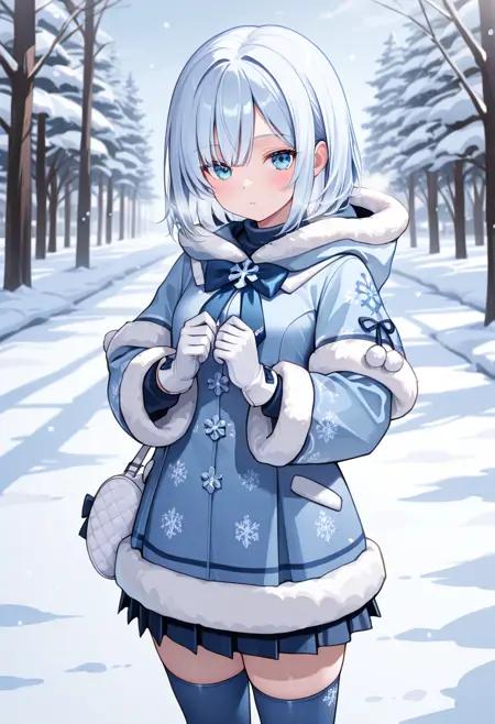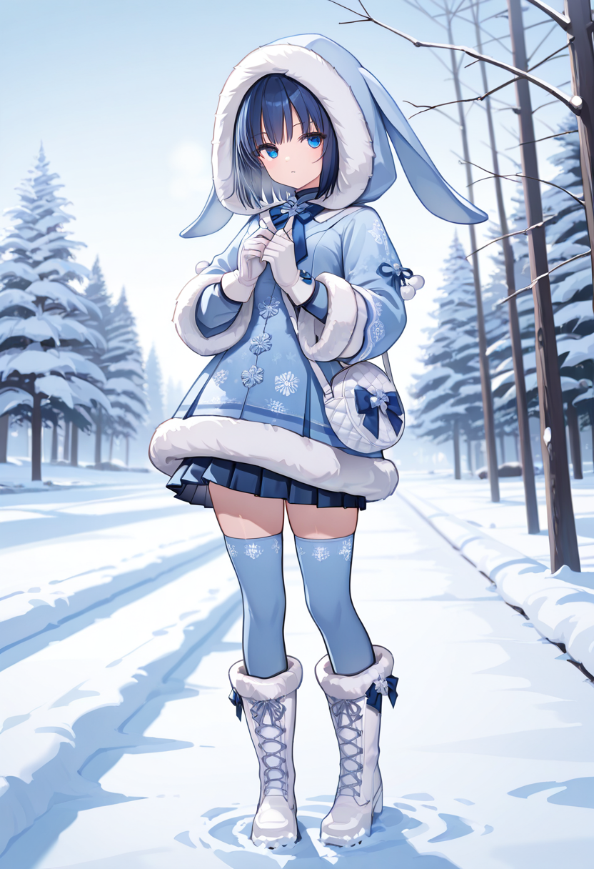 fur-trimmed blue dress,long sleeves,bag,blue thighhighs, pleated skirt,white gloves,fur-trimmed sleeves