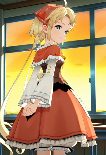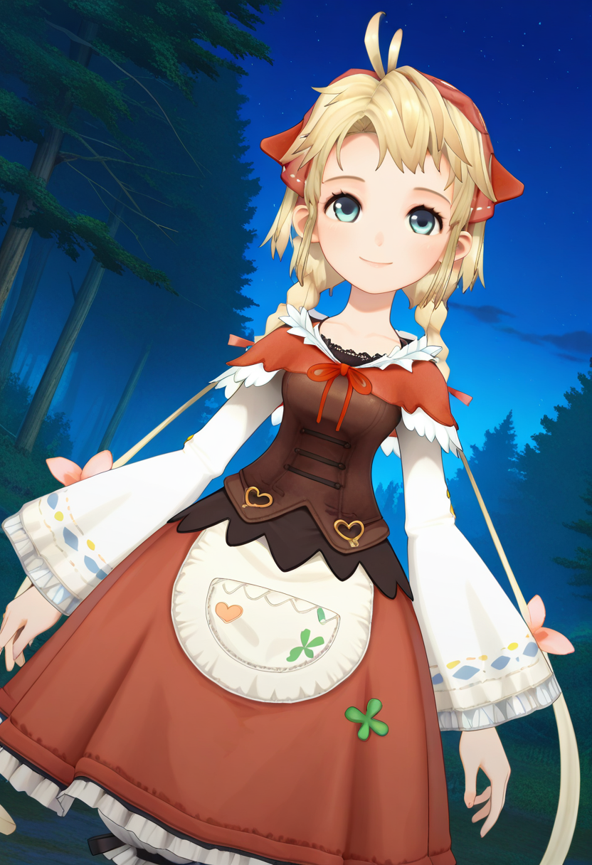 복장 - 머리수건, 빨간 카프레, 갈색 코셋, 빨간 치마, 흰색 블루머