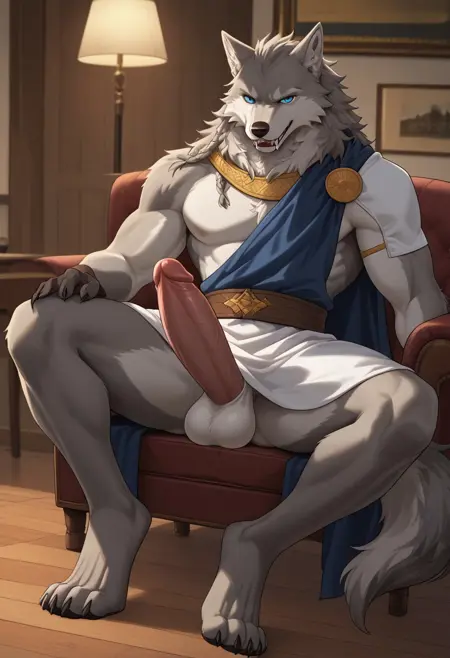 lycaon,wolf male,grey fur,blue eyes,animal ears,fluffy fur,tall male,white robe,cape,sharp teeth,fangs,braid,armor
