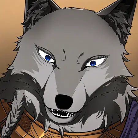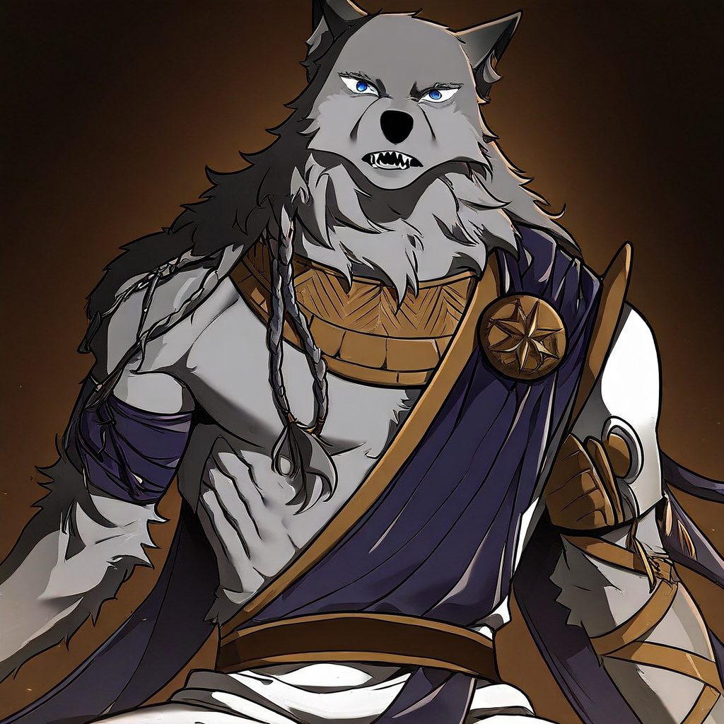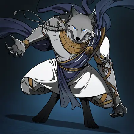 lycaon,wolf male,grey fur,blue eyes,animal ears,fluffy fur,tall male,white robe,cape,sharp teeth,fangs,braid,armor