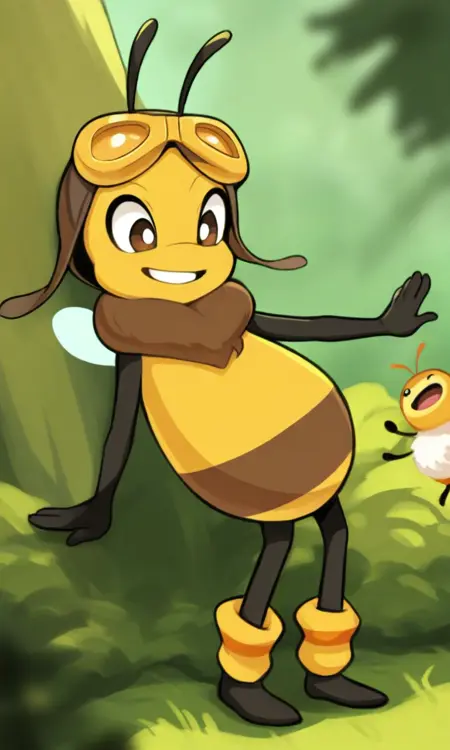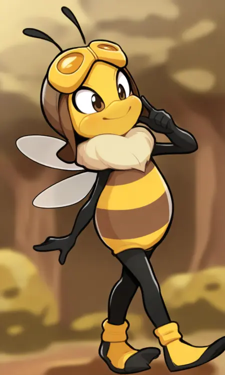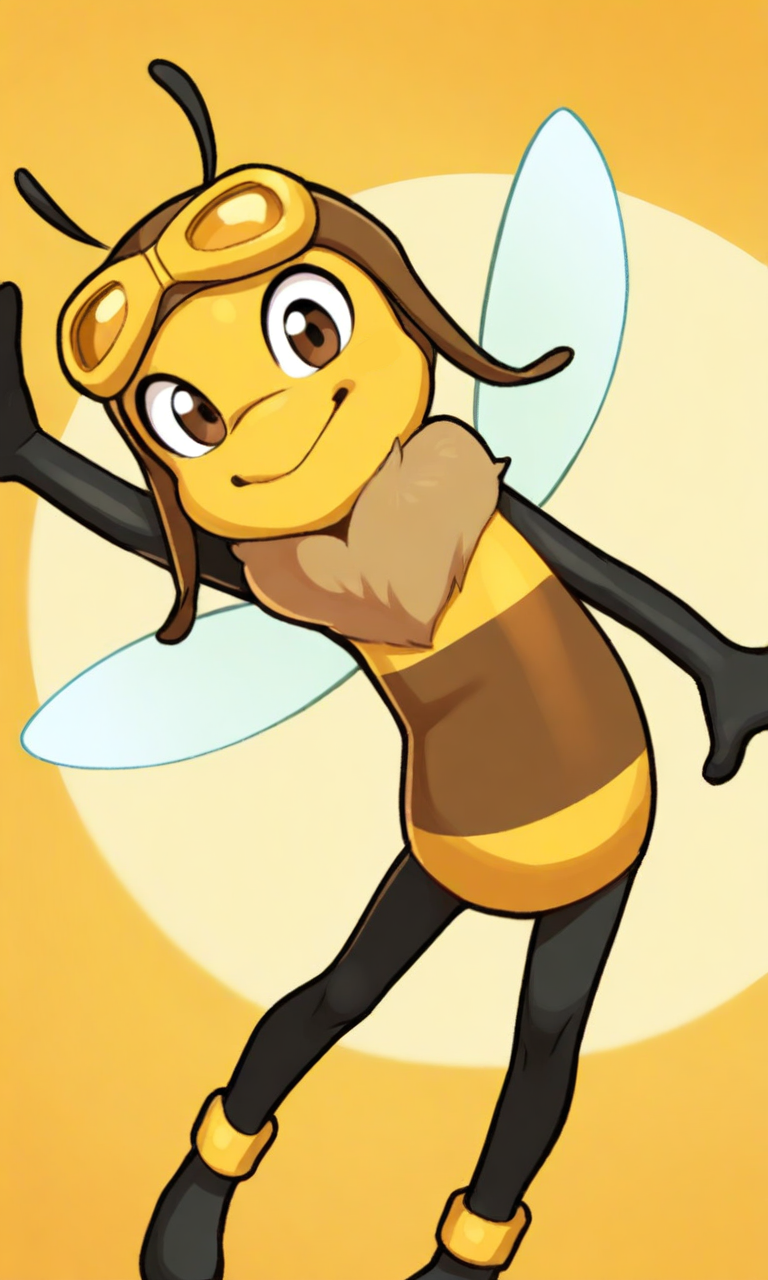 HP-MPBee, Bee, aviator goggles, yellow fur with a brown stripe in middle, large eyes, brown eyes, yellow skin, black arms, black legs,, two yellow ankle bracelet