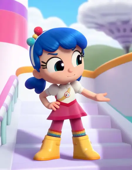true_tntrk, blue hair, white hairband, short twintails, puffy sleeves, pink skirt, pink leggings, rainbow striped socks, yellow boots