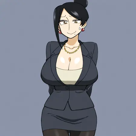 ((공식적, 진한 파란색 정장 재킷, 베이지 상의, 도가 지나친 가슴 선, 거대한 가슴 선, 진한 파란색 연필 스커트, 섹시한 투명한 검정 스타킹, 금색 목걸이, 큰 빨강 진주 귀걸이, ))