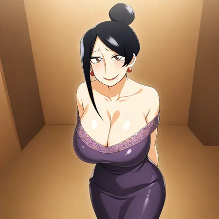 ((섹시한 에로틱한 절개된 무소매 어깨 드롭 보라색 드레스, 도가 지나친 가슴 선, 거대한 가슴 선, 큰 빨강 진주 귀걸이, ))
