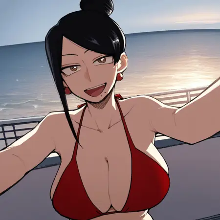 25. ((ショートスリーブのベージュトップ、過剰な胸元、巨大な胸元、濃紺のズボン、大きな赤い真珠のイヤリング))