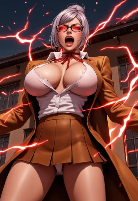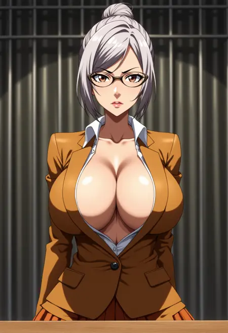 a short, tight brown suit coat with a white collar, that is open to reveal deep cleavage. Matching her suit coat is a pleated skirt. Around her neck is a red ribbon tie.