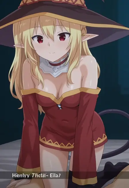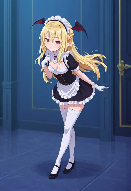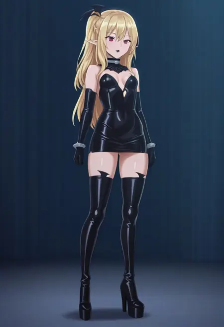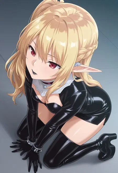 1girl, Tiffany lilystella, one sided ponytail, blonde, shor hair, elf ears, red eyes, slim, short girl, small breasts, thick thights, petite body,