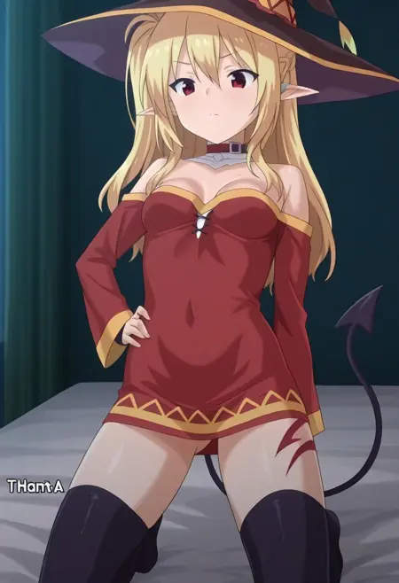 black thighthighs, bodymarks, tatto, stomach, black gloves, straps, feet thighthighs cut, ffet cut, demon girl, tail, frilled collar,
