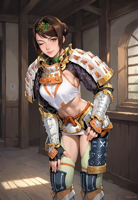 - crop top, midriff, miniskirt, sode, kote, armor, gauntlets, waist armor, thighhighs, fingerless gloves, sandals,