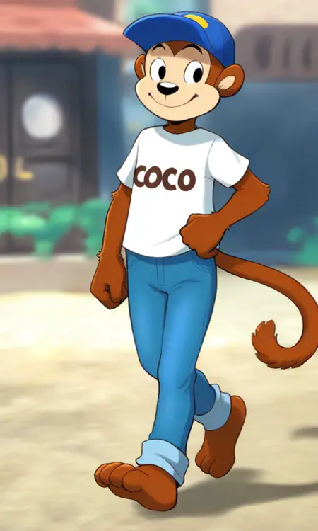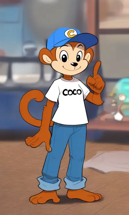 CCMK, Monkey, Brown fur, White shirt with "coco" on it, Blue jean, blue cap with a "C" on it, barefoot, long tail, large black eyes, 1boy, solo