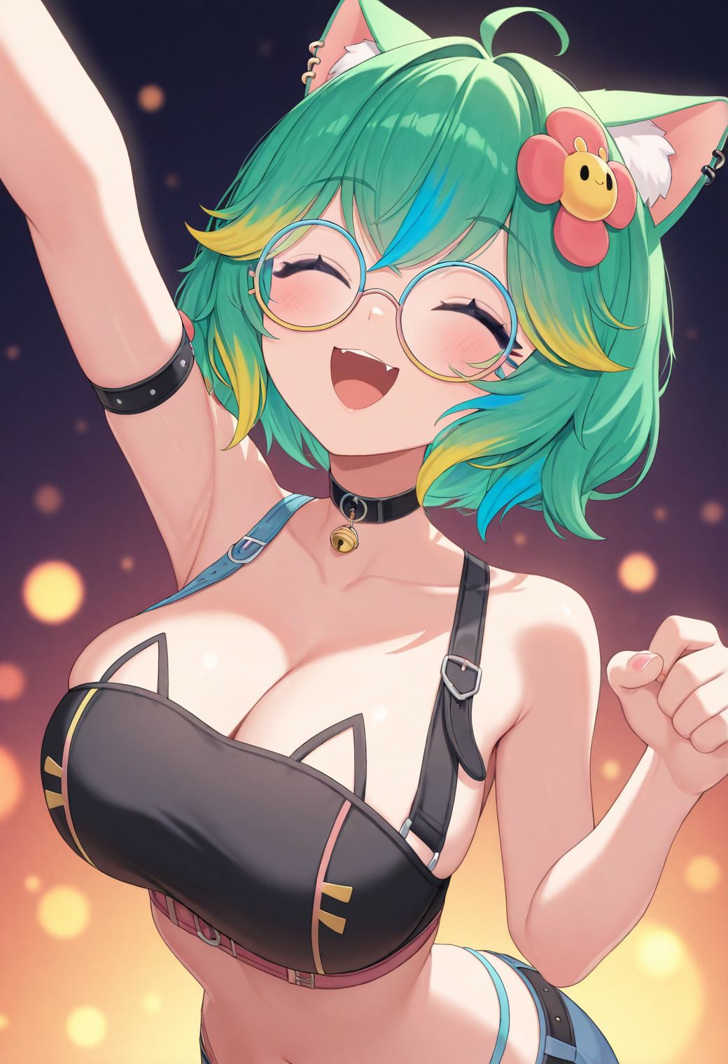 rosedoodle_(vtuber), multicolored hair, green hair, looking at viewer, virtual youtuber, choker, streaked hair, smile, blue hair, glasses, animal ears, round eyewear, cat ears, short hair, cleavage, large breasts.