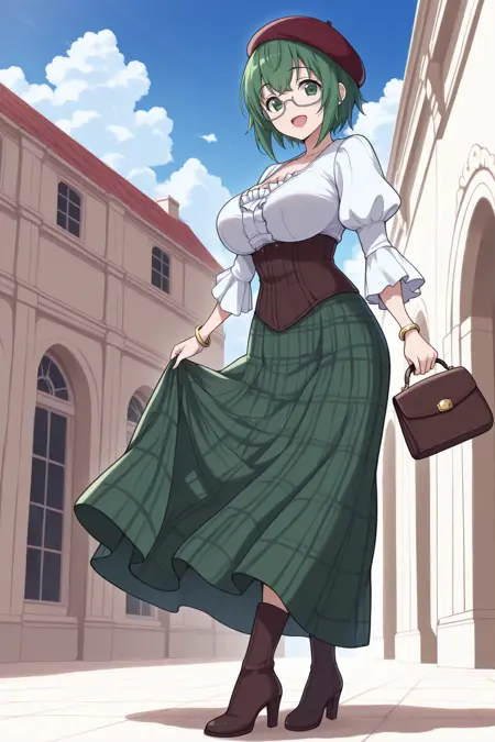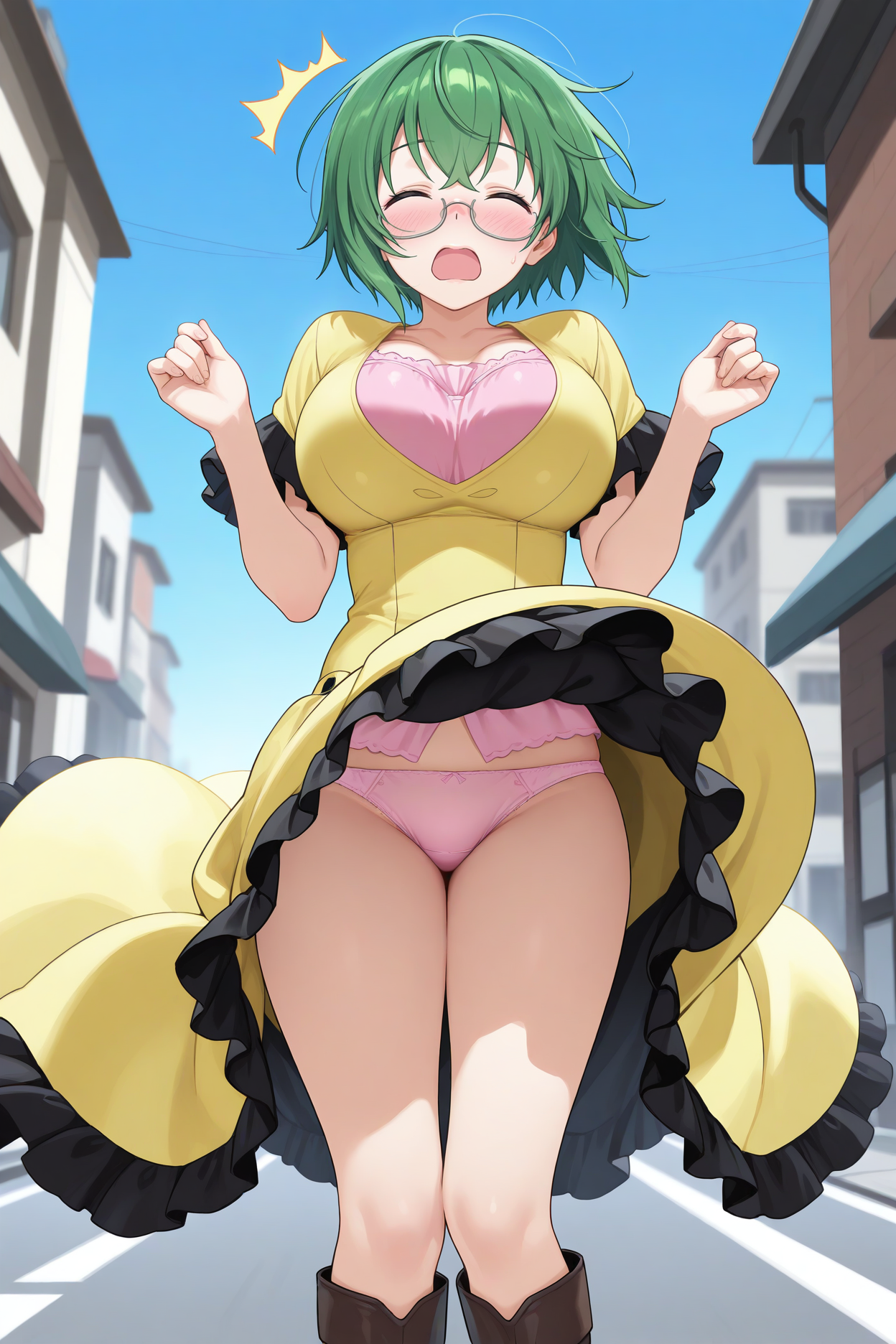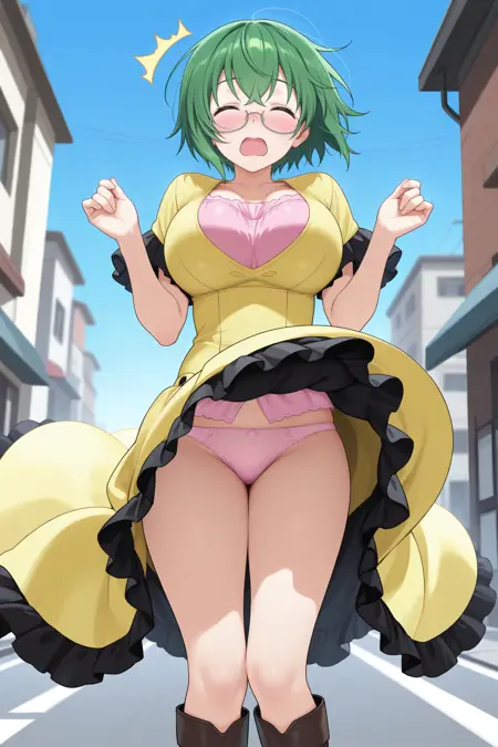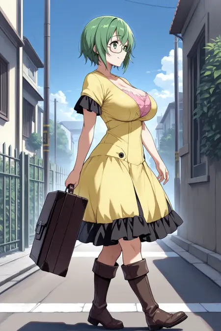 일반적인 외모를 위해 "안경, 언더림 안경, 노란색 드레스, 가슴 선, 분홍색 속옷, 짧은 소매, 검은 프릴, 갈색 부츠, 무릎 부츠"를 추가하세요.